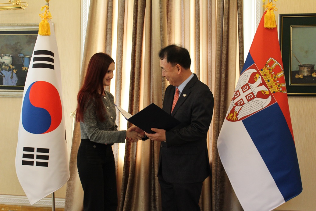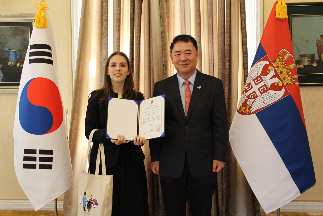 우리 대사관은 5.28.(수) 에세이 공모전 "내가 경험한 한국" 수상자와 금년 선발된 제6기 디지털 서포터즈 활동가들을 관저에 초대하여 상장 및 임명장 수여식을 진행했습니다. 김형태 대사는 참석자들이 한국에 대한 애정과 관심을 바탕으로 대사관의 활동에 열정적으로 참여해 주어 뜻깊게 생각한다고 언급한 뒤, 경제, 문화 등 다방면에서 한국과 세르비아가 가까워지고 있는 지금, 참석자들이 양국 친선 관계의 가교 역할을 해 줄 것을 당부했습니다. 우리 대사관은 인스타그램을 통해 5월부터 에세이 공모전 수상작을 소개하고 있으며, 디지털 서포터즈들이 제작한 우수 콘텐츠도 인스타그램에 게재할 예정입니다. 우리 대사관의 소셜 미디어는 세르비아 국민 여러분들과 함께 만들어가는 공간입니다. 앞으로도 여러분들의 많은 관심 부탁드립니다.