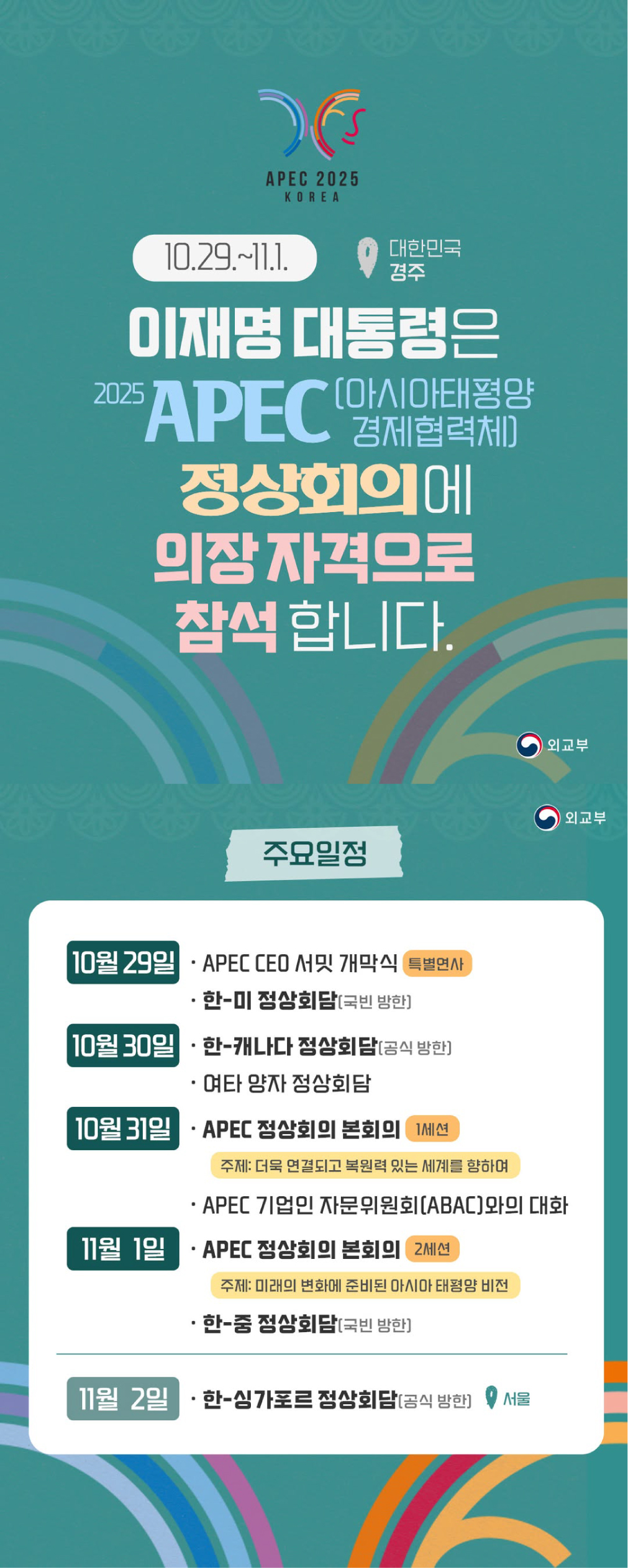 120-1 외교부-25-011 APEC 정상회의의 성공적 개최 - 2025년 APEC 의장국으로서 미·중·일·러를 포함한 21개 회원을 견인, 성공적 정상회의 개최(10.31-11.1)
